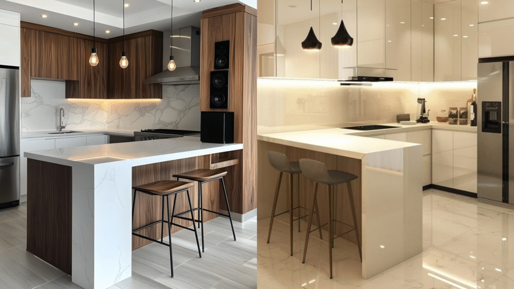 • Materiales Duraderos y con Estilo: La elección de materiales es fundamental para la estética y la durabilidad. Trabajamos con una amplia gama de opciones para encimeras (cuarzo, porcelánico, laminado) y acabados para muebles (lacado, madera, melamina), seleccionando los que mejor se ajustan a tu estilo de vida y presupuesto.